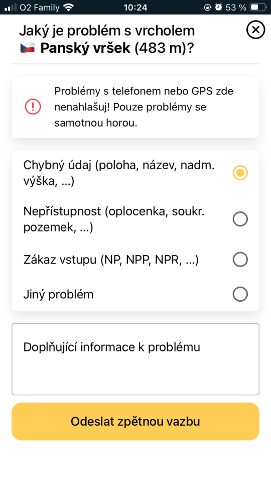 Sin duda puedes ayudarnos recordándonos este pico (coordenadas del pico) enviando un correo electrónico a info@horobrani.cz. La fuente de verificación para nosotros son siempre los geoportales nacionales, para la República Checa es simplemente el Geoportal de la ČÚZK, que puedes encontrar en la aplicación con el nombre Mapa Base. Cambia a esta capa y entonces podrás verificar si el pico cumple los requisitos anteriores. Puedes averiguar las coordenadas manteniendo el dedo en el mapa. Gracias de antemano por tu ayuda.